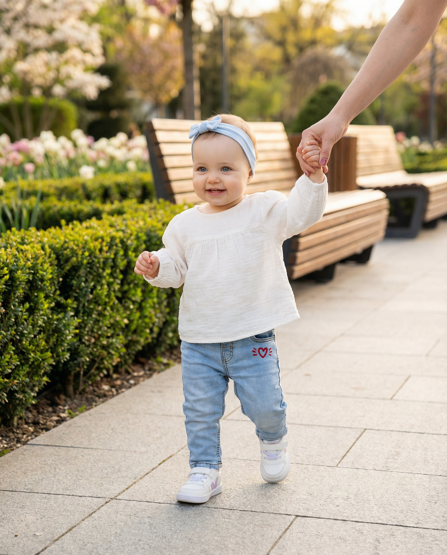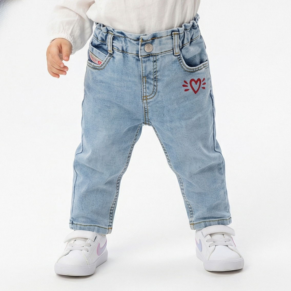 Фармерките имаат практичен еластичен појас кој овозможува лесно облекување и совршено прилегање. Декоративниот принт со срце додава симпатичен и модерен изглед, што ги прави овие фармерки одлична комбинација со различни блузи, маички или дуксери.