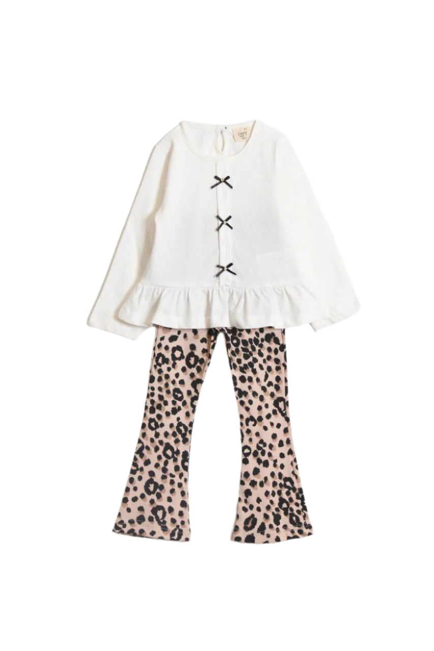Горниот дел со декоративни машнички и набори на крајот е совршено надополнет со еластични хеланки со модерен леопард дезен.