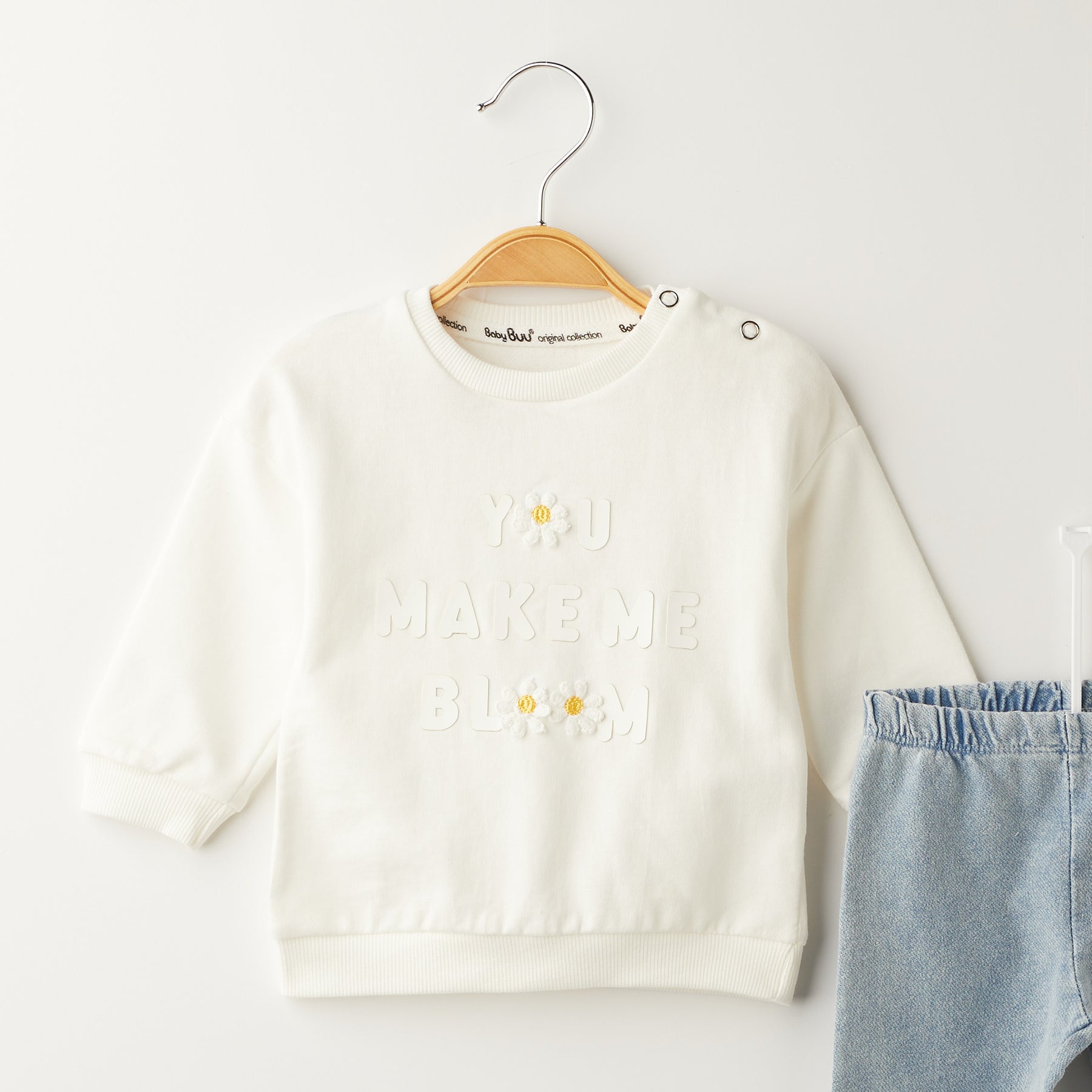 • Со принт „YOU MAKE ME BLOOM“ украсен со цветови.
