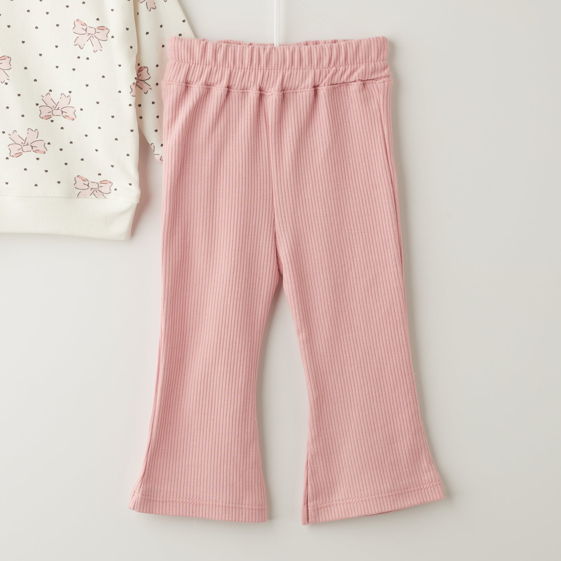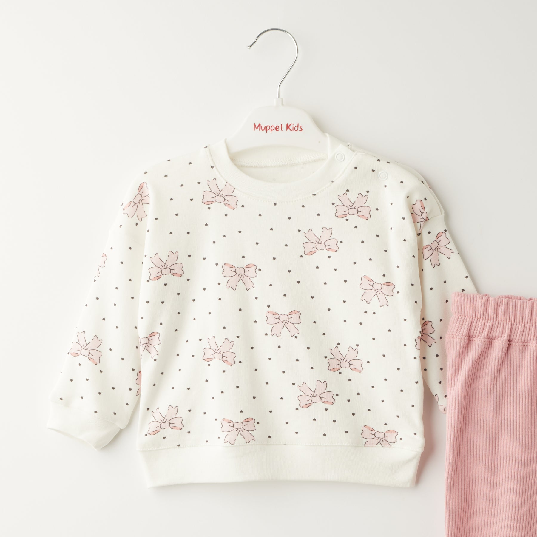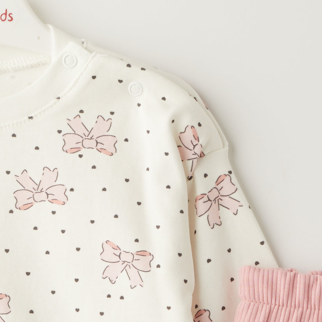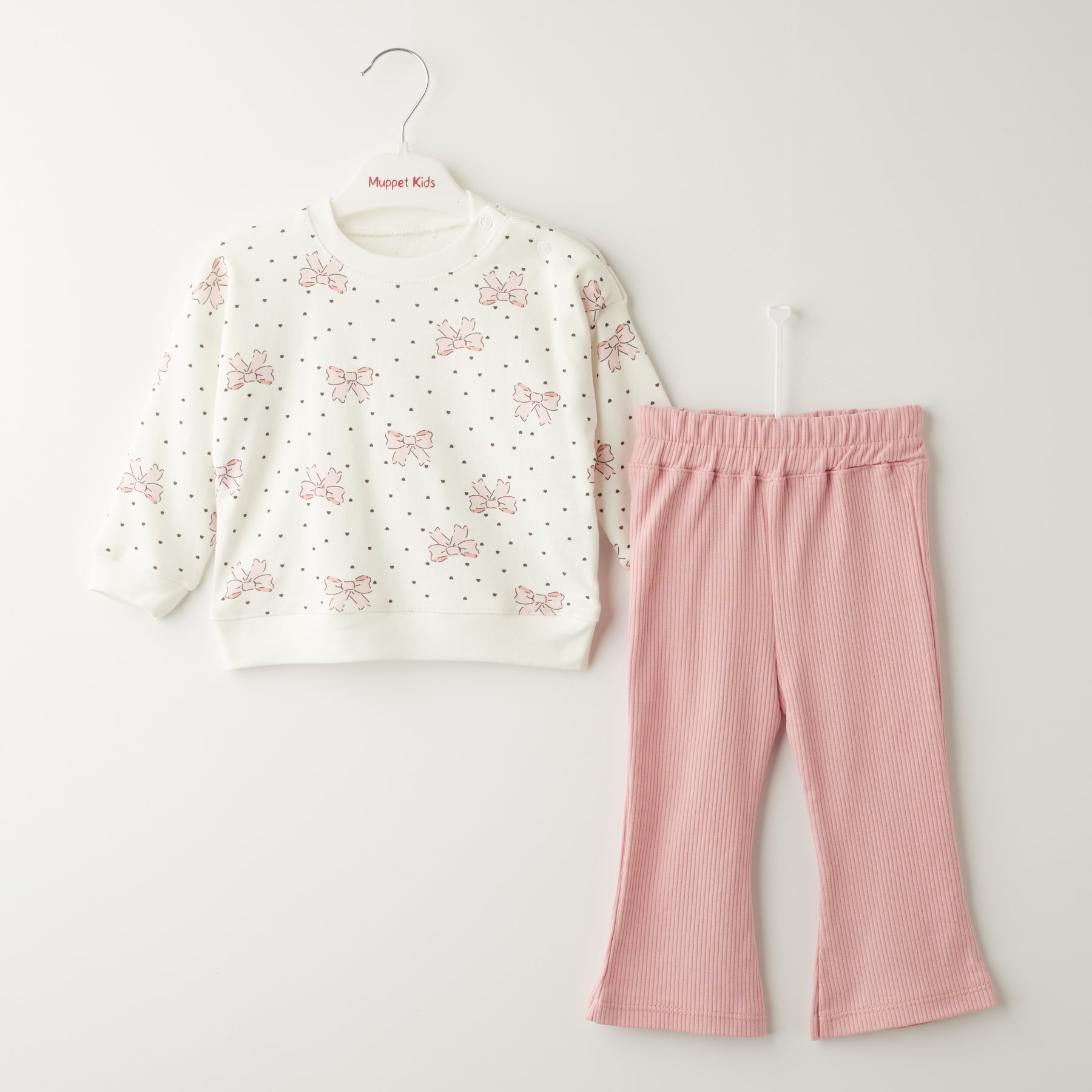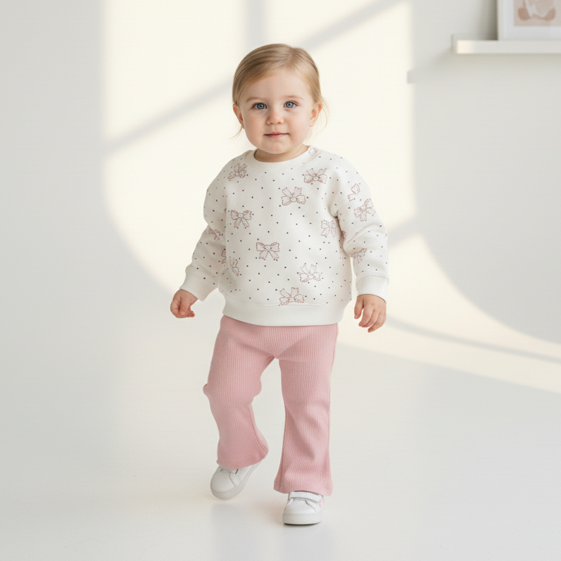 Се состои од памучна блуза со принт од розови машни и точки и еластични ребрасти панталони со поширок крај, што создаваат модерен, но и практичен изглед.