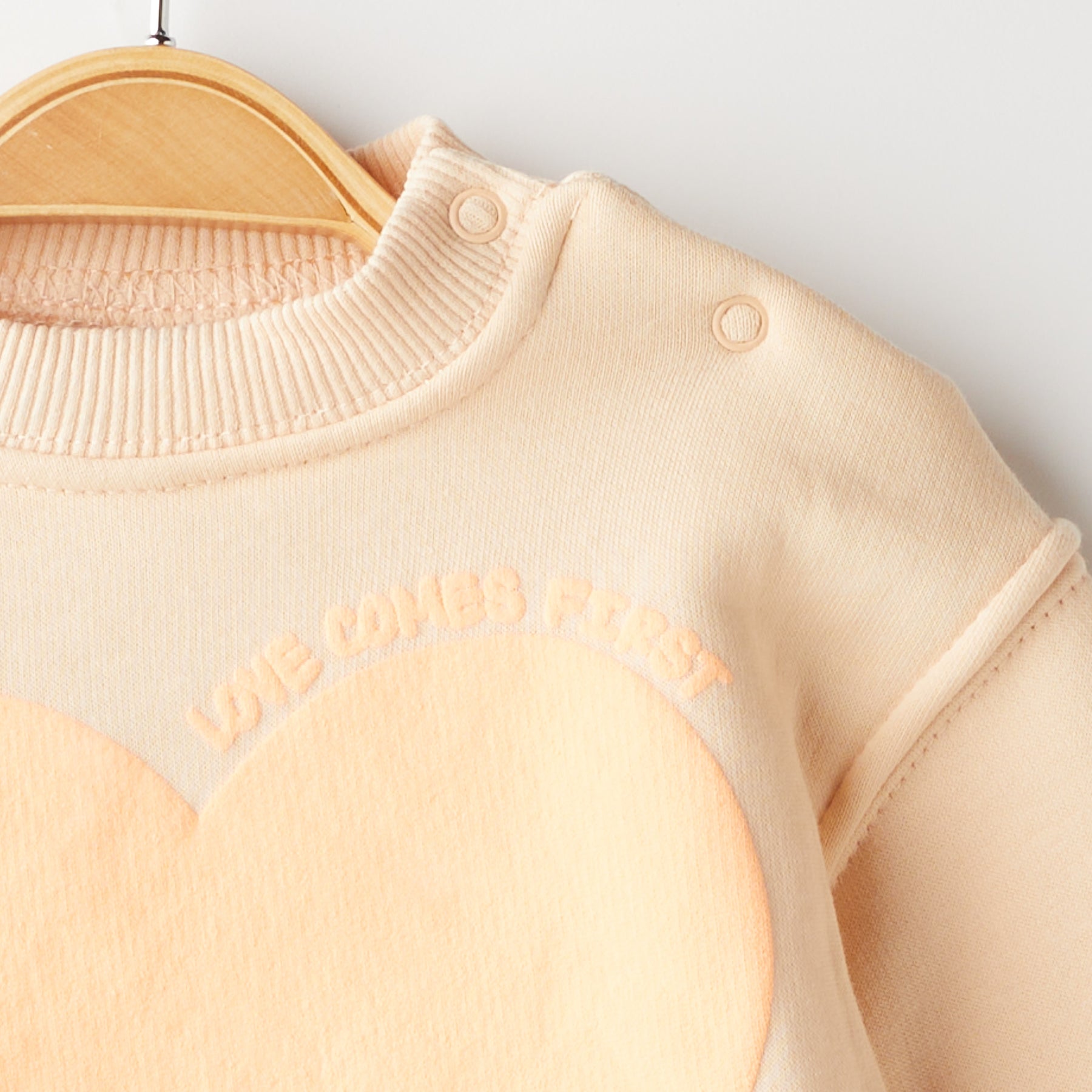 Блуза во нежен крем тон, украсен со големо срце и натпис “You Bring Love”. Материјалот е топол, но дише и пријатен за носење.