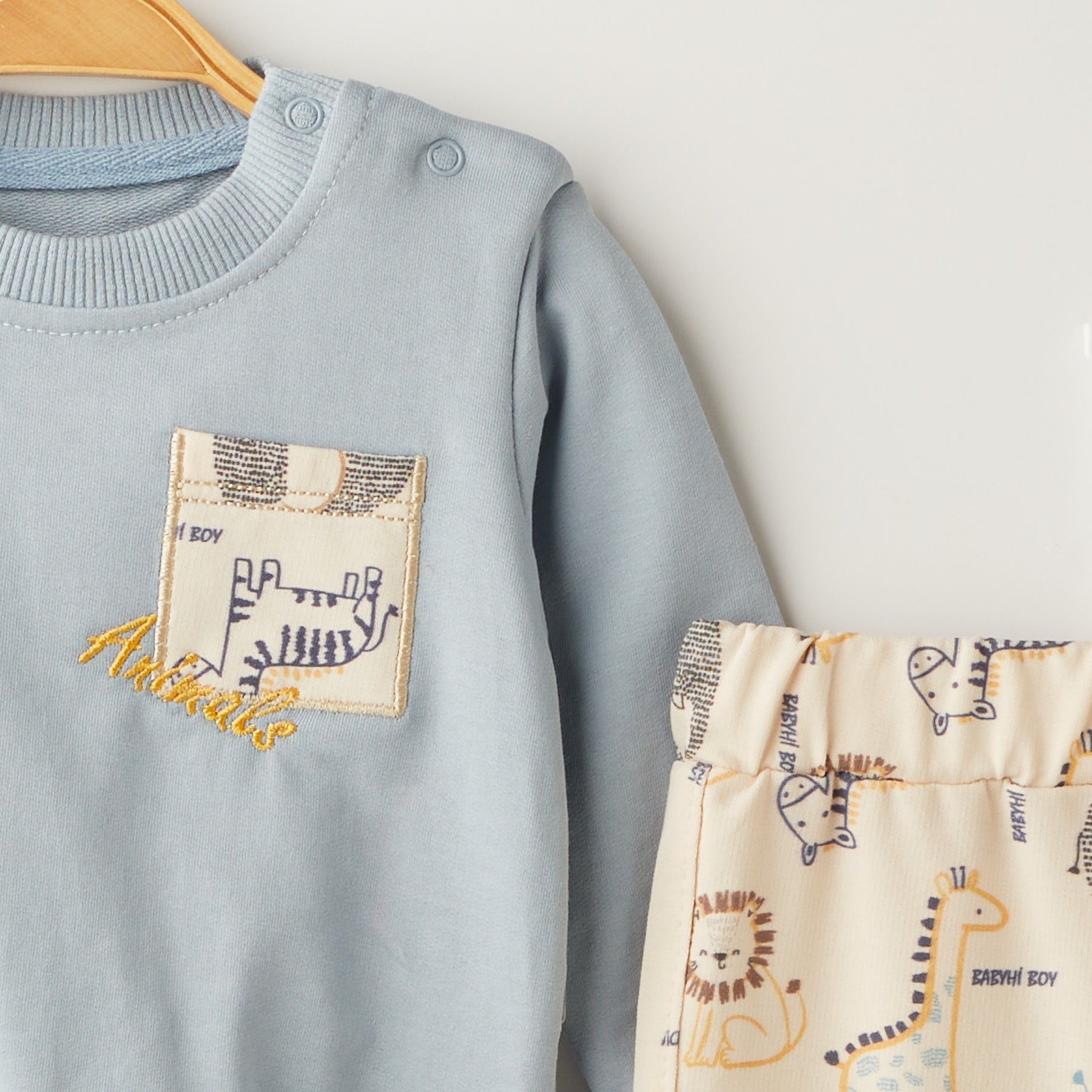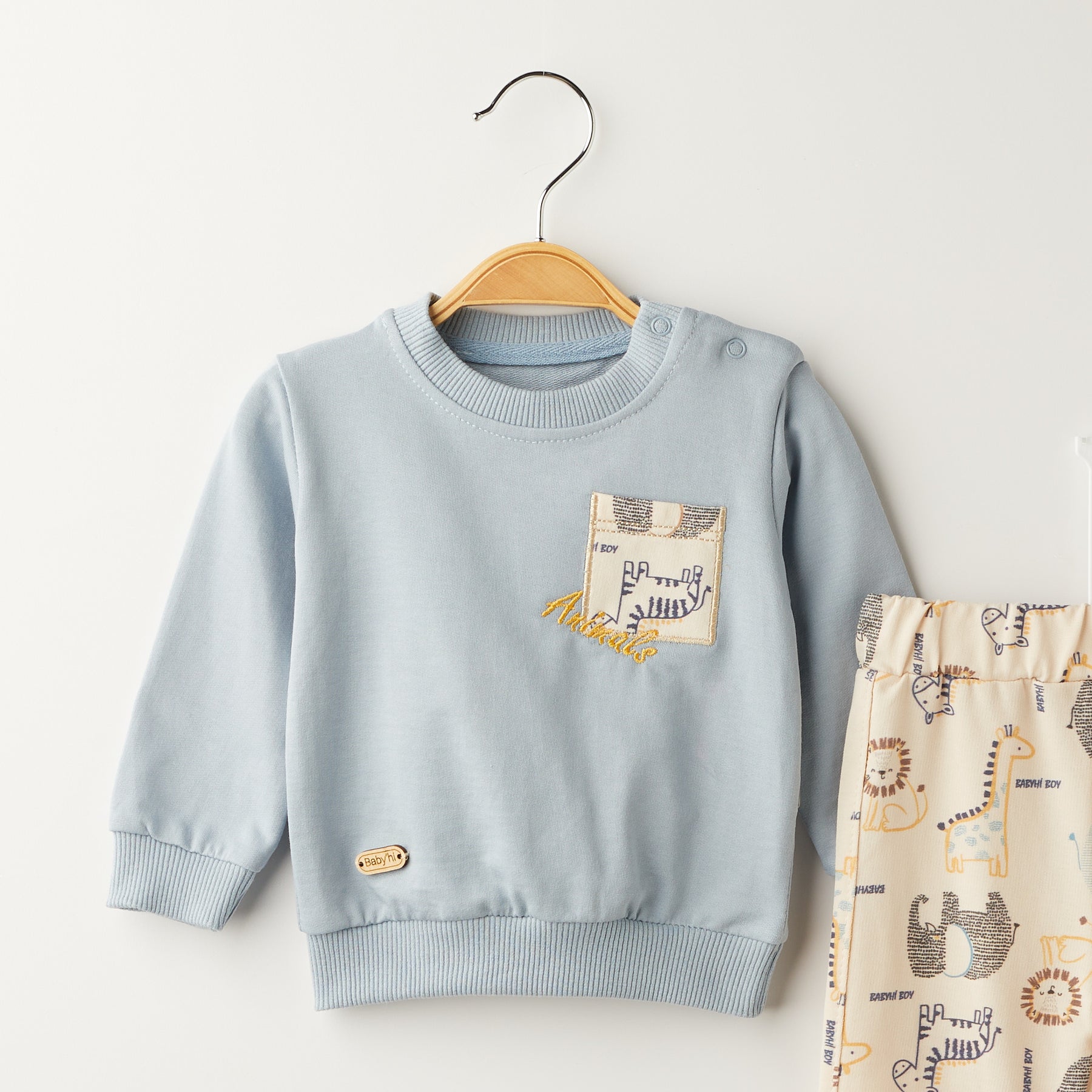 Дуксерче во нежна сино-пастелна боја, украсено со мал преден џеб со апликација на животинче.