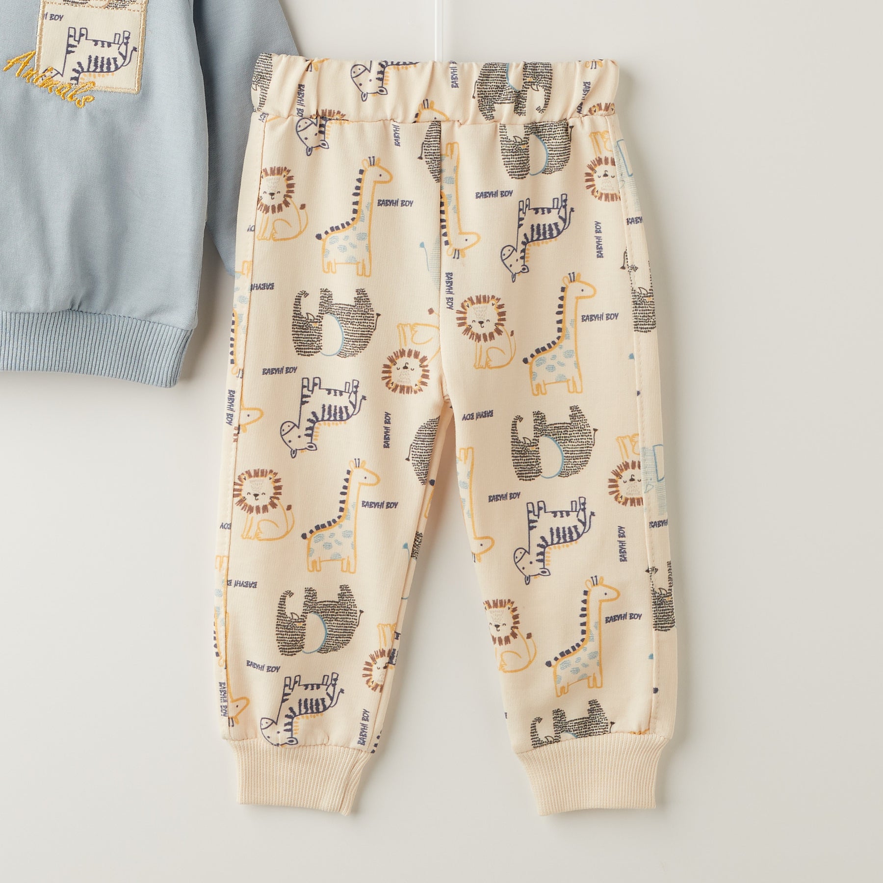 Панталончиња во крем нијанса со весел принт од лавови, жирафи и слонови.