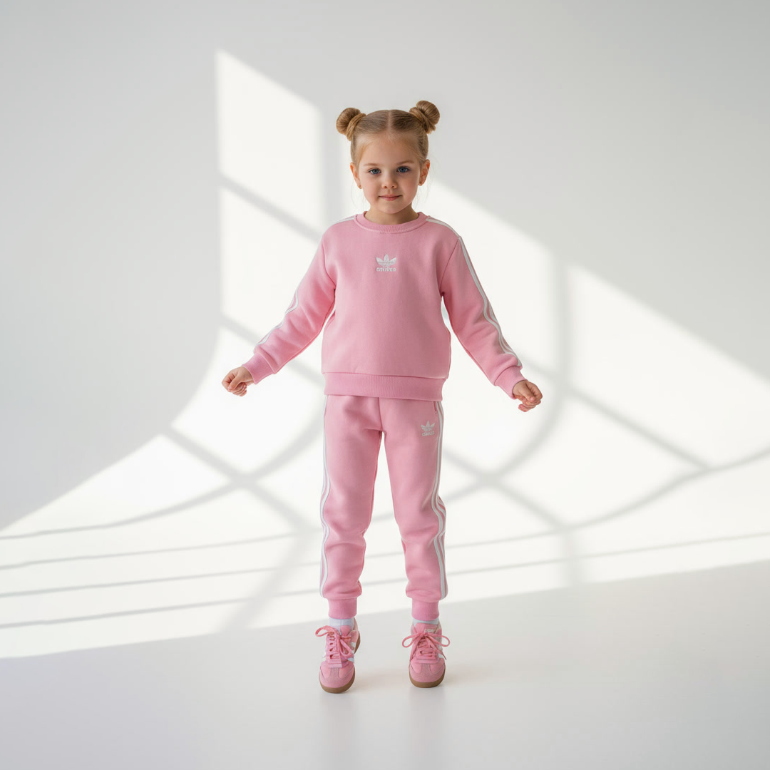 Изработен од мек и пријатен материјал, сетот овозможува слободно движење и идеална удобност при игра, прошетки или спортски активности. Горниот дел е со долг ракав и препознатливи триделни линии по ракавите, а долниот дел има еластичен појас и манжетни за совршено пристојување.