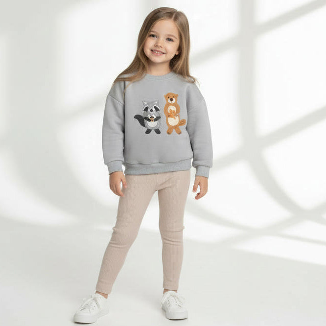 Сивата поставена блузичка со симпатичен дизајн на ракун и мече додава весел и разигран изглед, додека сивите хеланки нудат дополнителна топлина и удобност за постудените денови.