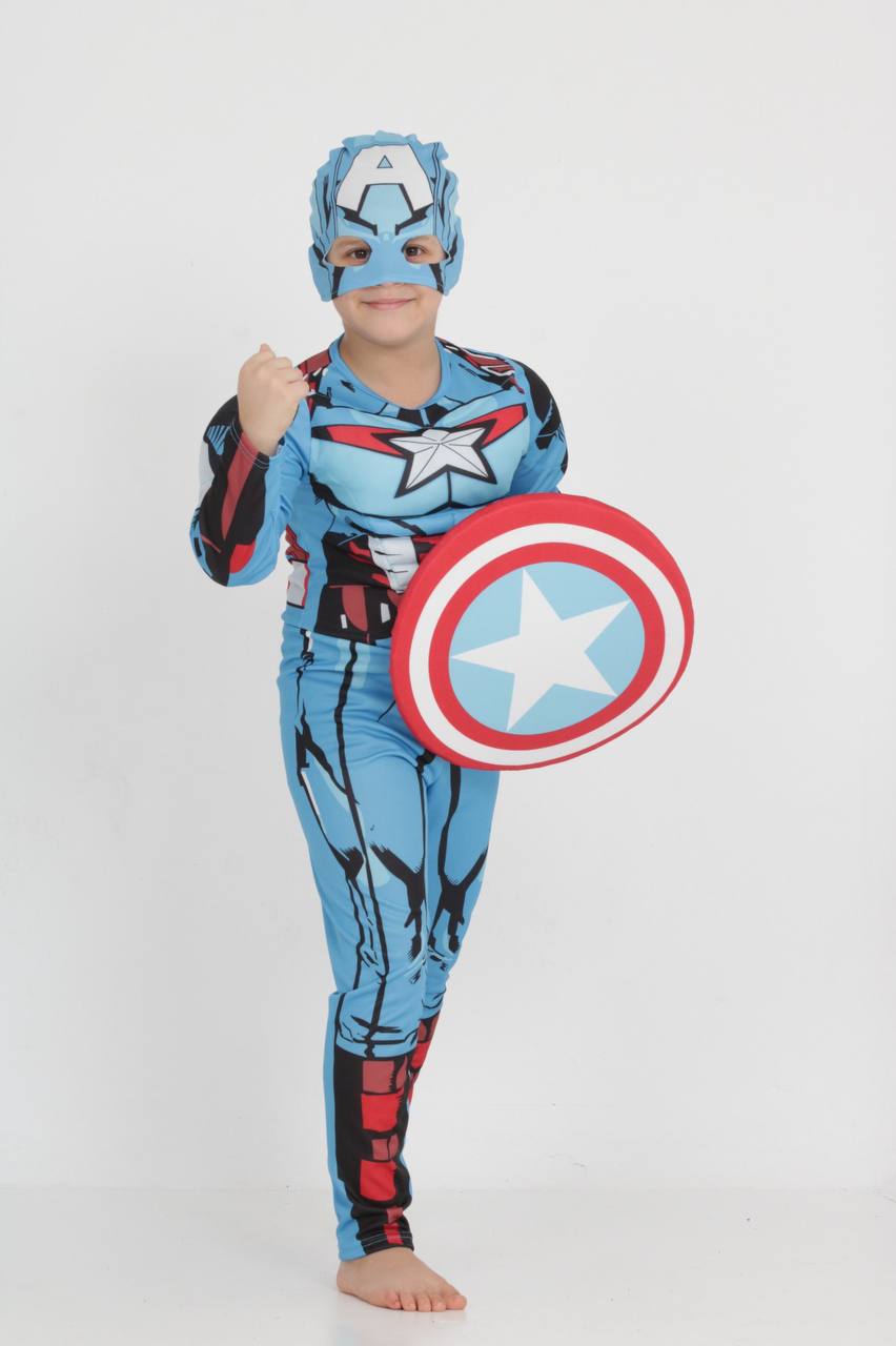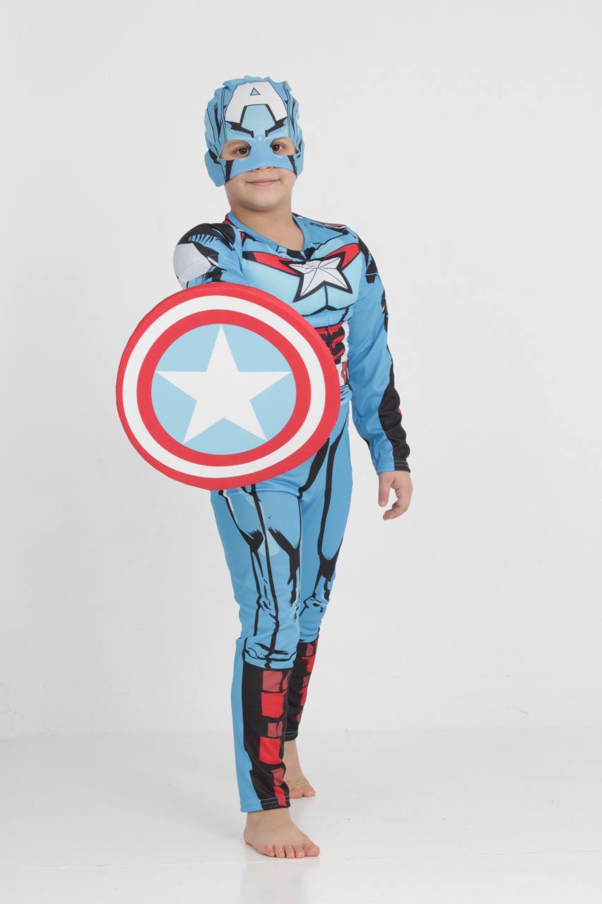 Впечатлив костим инспириран од Captain America, со препознатливи бои, ѕвезда на градите и легендарен штит. Идеален избор за деца кои сакаат акција, херојски улоги и тематски забави.