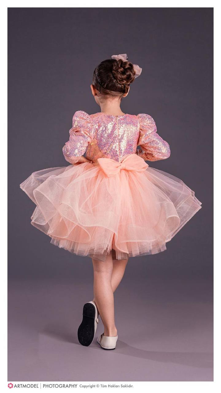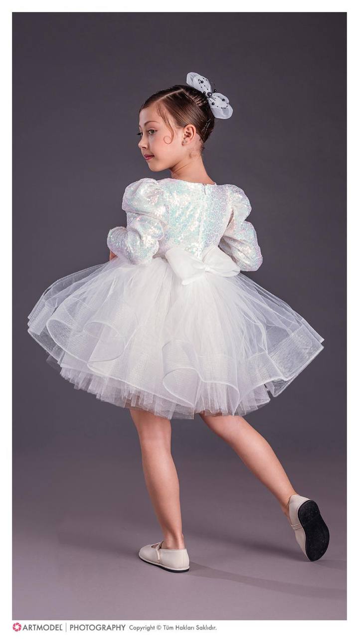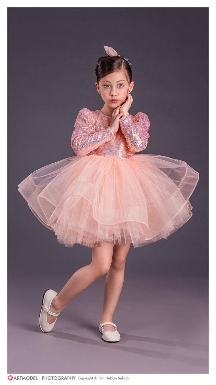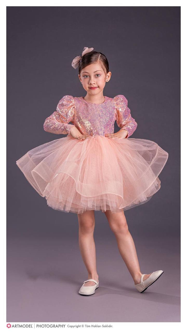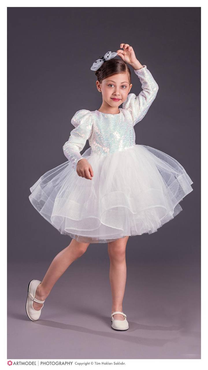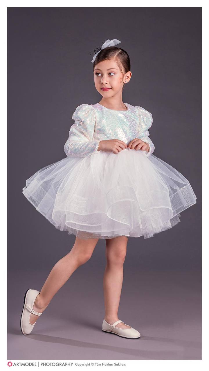 Овој елегантен фустан е дефиниција за стил и гламур. Со светкав горен дел и раскошна тул сукња, создаден е за девојчиња кои сакаат да изгледаат како вистински ѕвезди на секоја свеченост.