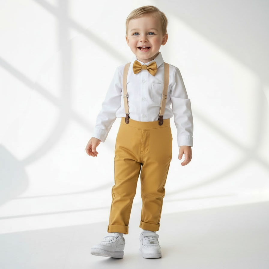 Елегантен комплет со бела кошула, панталони во топла жолта нијанса и шпринки и лептир мапна кои даваат посебен шарм.