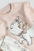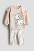 Се состои од блузичка со апликација на мече и срце и еластични хеланки со дискретен принт, идеални за движење и игра.