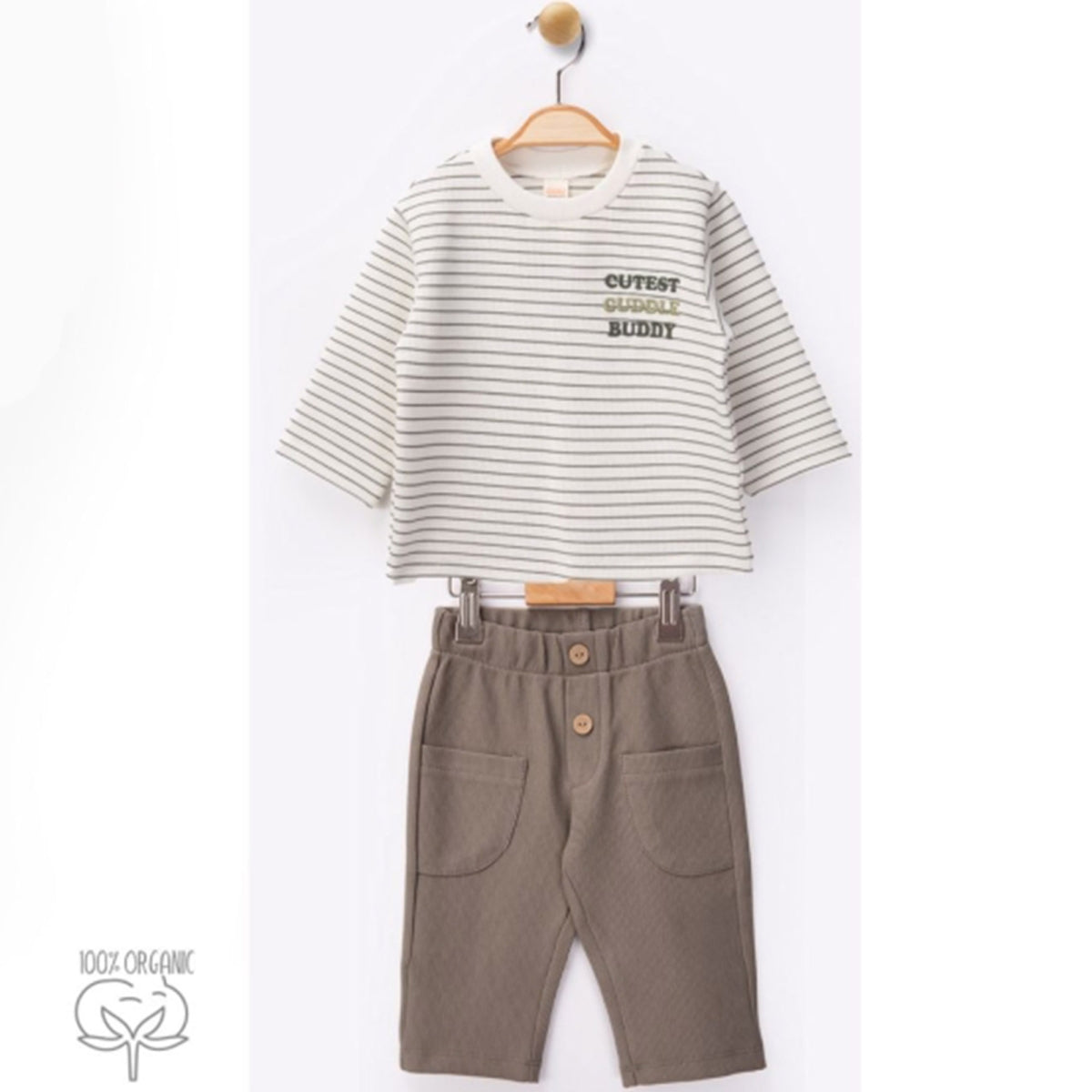 Се состои од памучна блуза со фини линии и натпис “Cutest Cuddle Buddy” и удобни панталончиња.