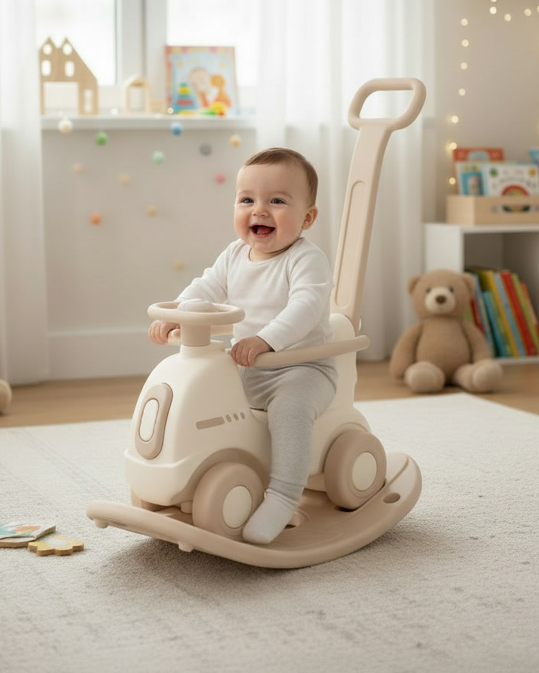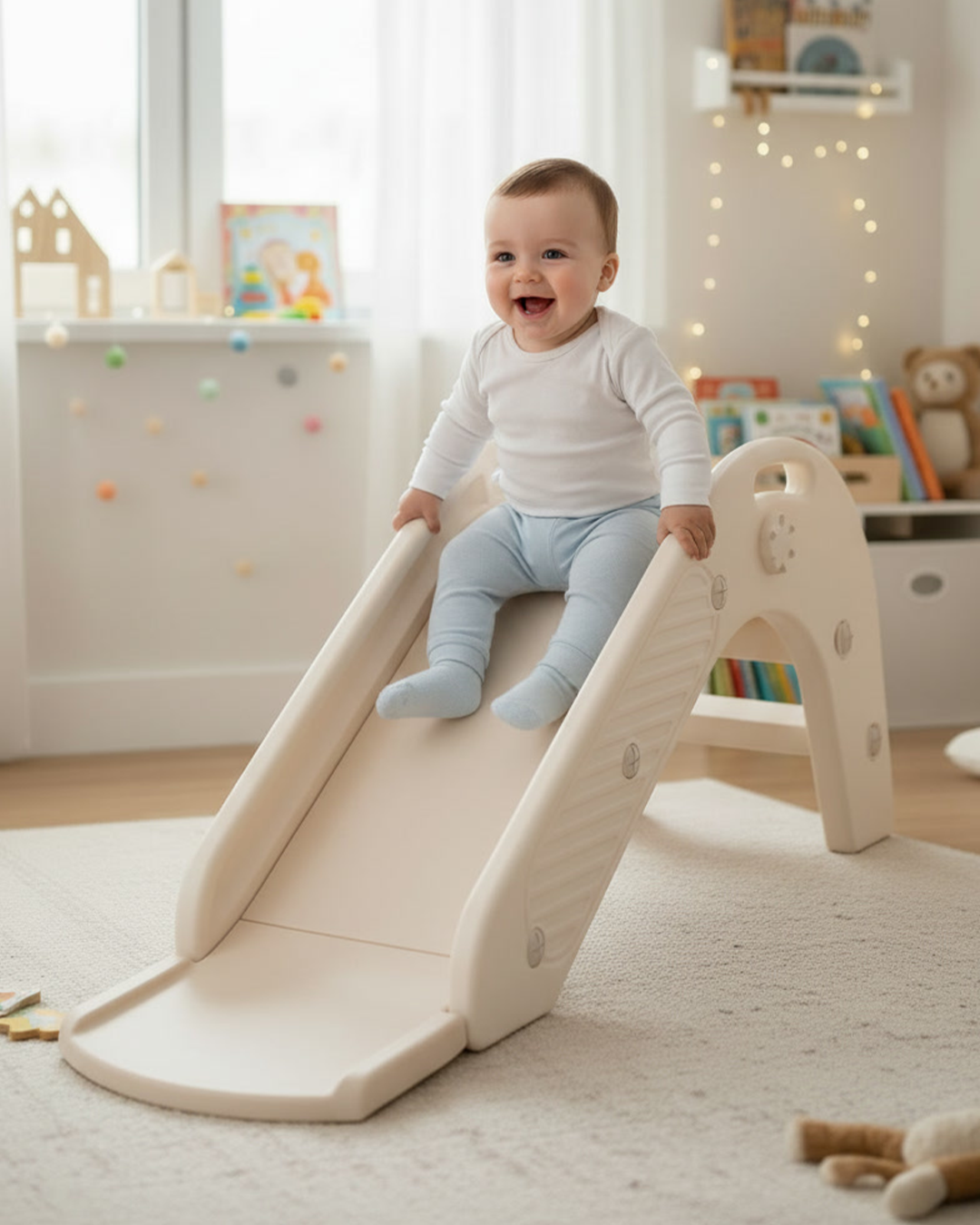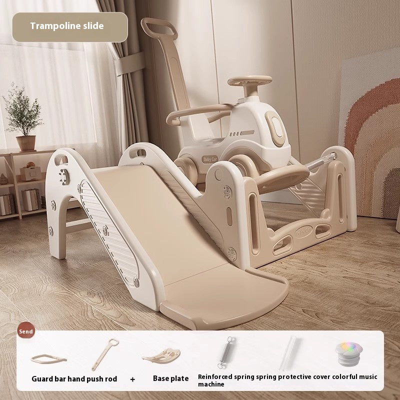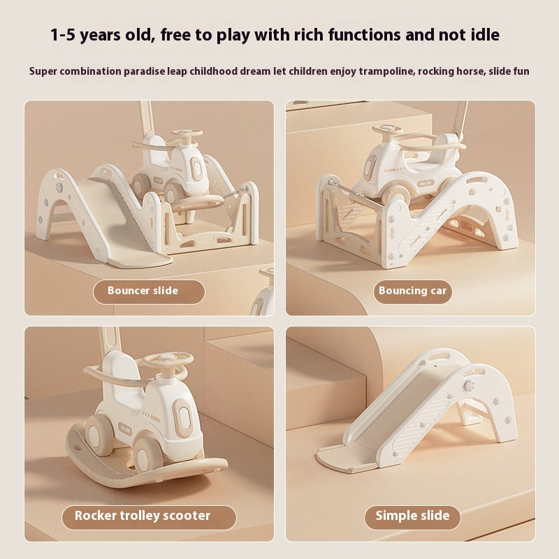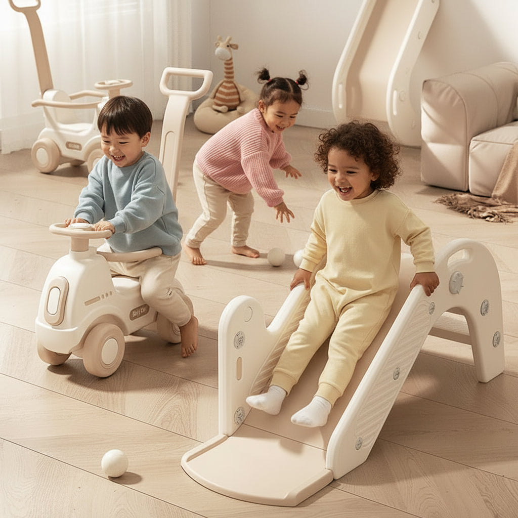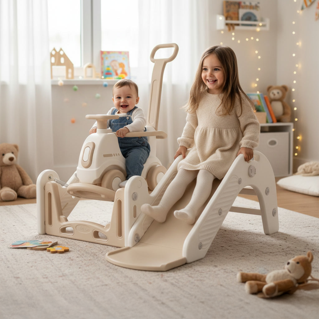 Овој производ е позициониран како компактна, мултифункционална играчка што комбинира лизгалка + количка-туркач (ride-on) во едно оптимизирано решение за домашна употреба. Концептот е јасно насочен кон растење со детето и максимално искористување на секоја фаза од раниот моторен развој.
