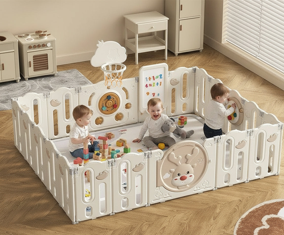 Овој детски ограден простор (playpen) е проектиран како контролирана и безбедна зона за игра, со јасен фокус на функционалност, развој и максимално искористување на просторот во домот. Производот обединува заштитна ограда + интерактивни елементи + моторна стимулација, во единствен модуларен систем.