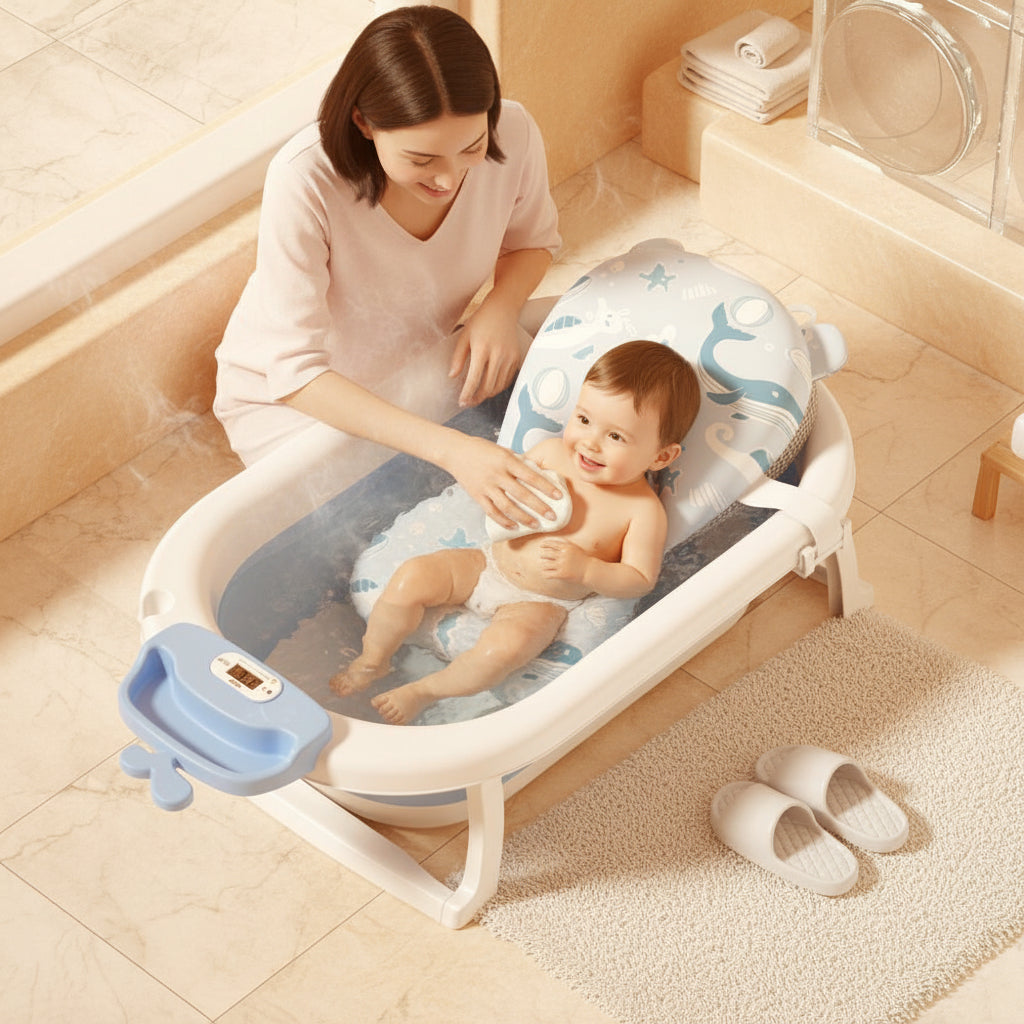 Оваа склоплива мултифункционална бебешка када со дигитален термометар (44L) во Temperature-Sensitive Blue варијанта е конфигурирана како практично и контролирано решение за безбедно и удобно капење. Комбинира прецизна контрола на температурата, стабилна конструкција и анатомска подлога за капење со цртан дизајн, со јасен фокус на функционалност и организација.