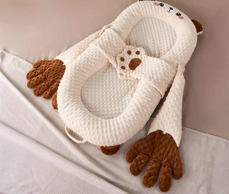 Гнездото обезбедува дефиниран простор за спиење, кој го имитира чувството на заштита слично на прегратка. Меките странични рабови служат како поддршка и бариера, додека централната површина е рамна и пријатна за лежање.