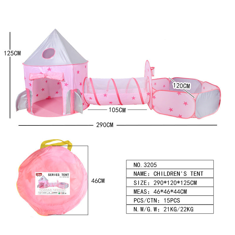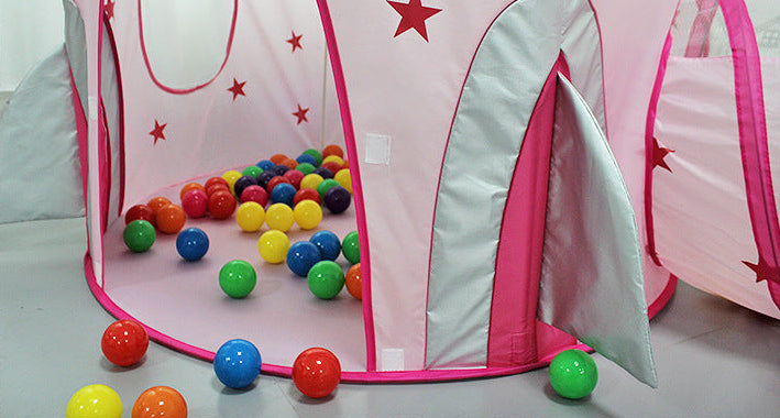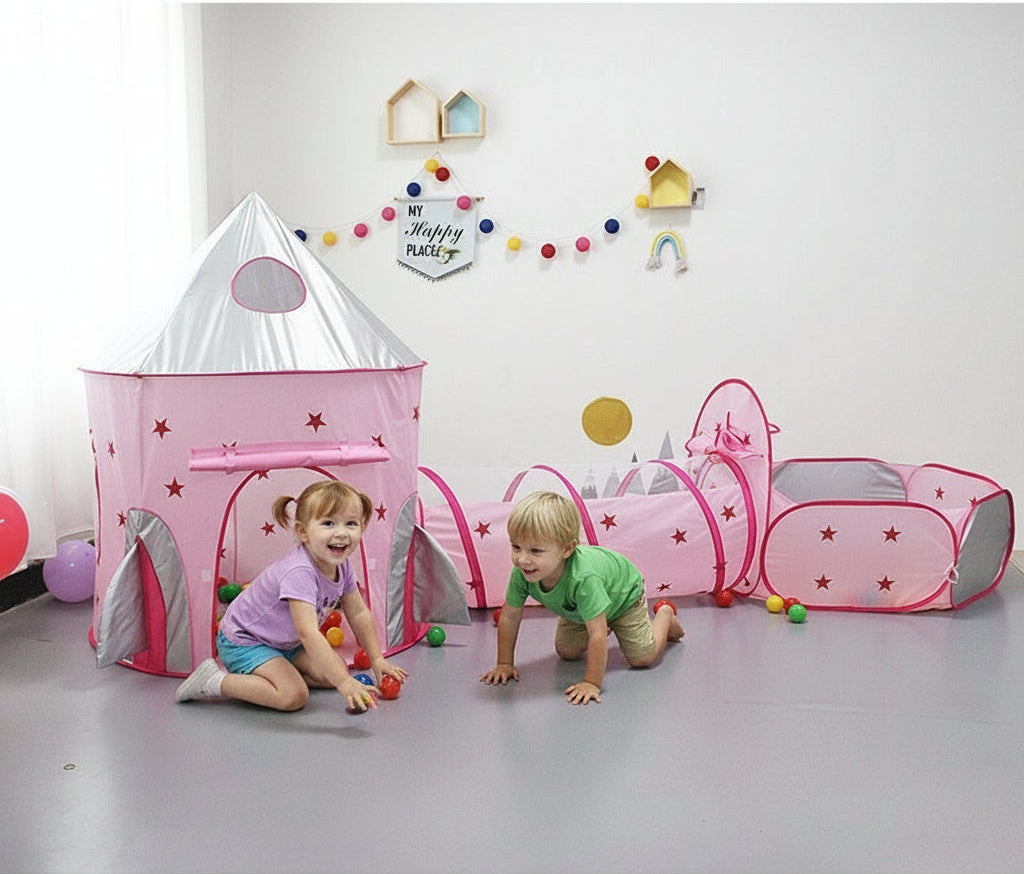 Детскиот шатор со замок, тунел и базен за топчиња е модуларен сет 3-во-1 кој создава целосна play-зона во домот. Системот вклучува кружен шатор во форма на замок, поврзувачки тунел и отворен простор за игра кој може да се користи и како базен за топчиња. Големите димензии овозможуваат повеќе деца истовремено да играат, без ограничување на движењето.