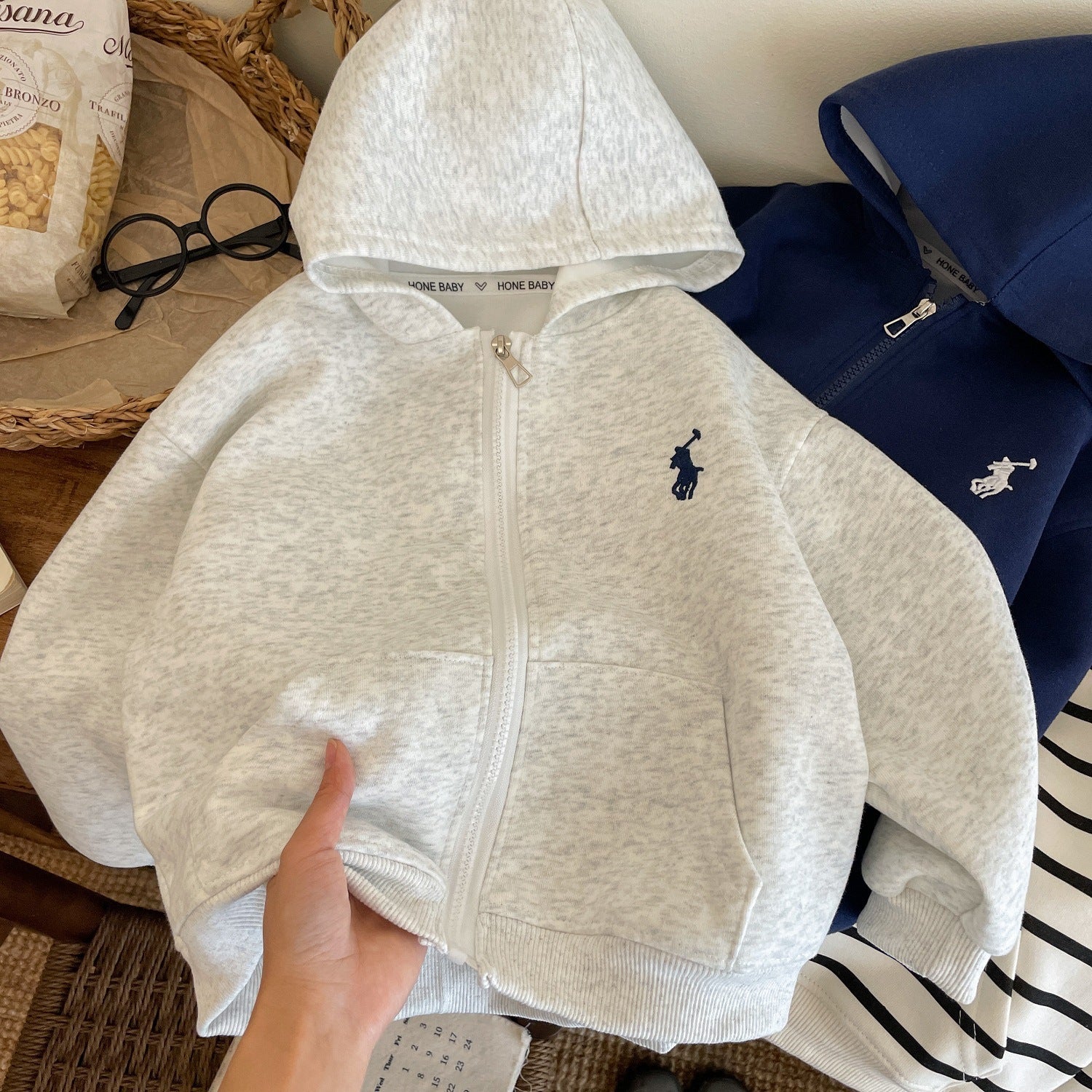Дизајнот вклучува патент по целата должина, капа за дополнителна заштита и два практични џеба напред. Минималистичкиот вез на градите додава суптилен спортски изглед, идеален за момчиња и девојчиња.