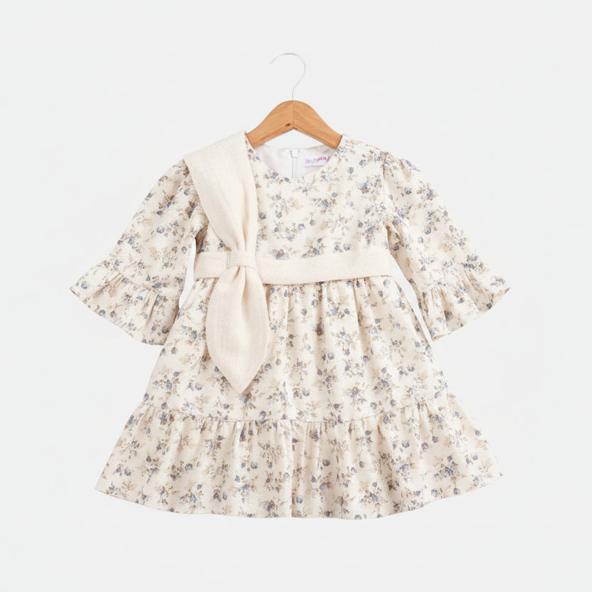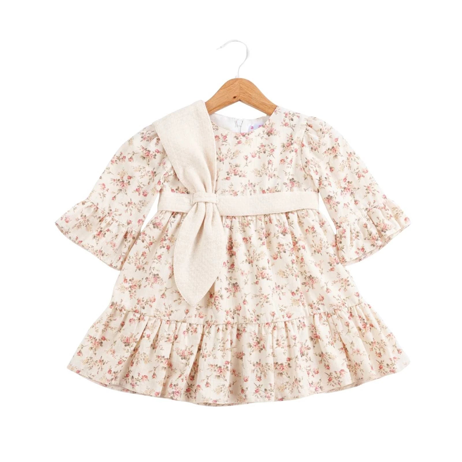Овој детски цветен фустан со машна е совршен избор за родители кои сакаат стилска и удобна облека за своето девојче.