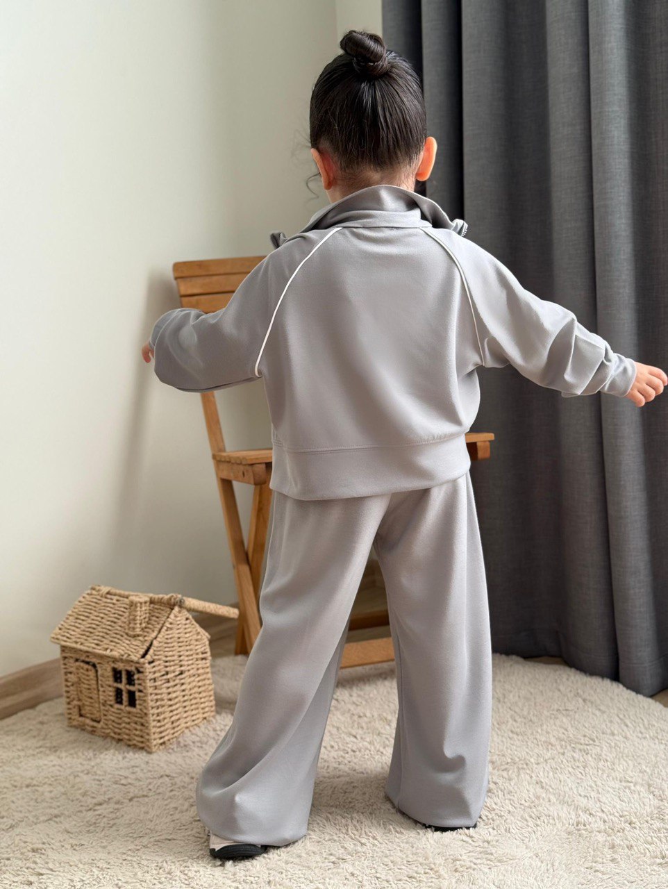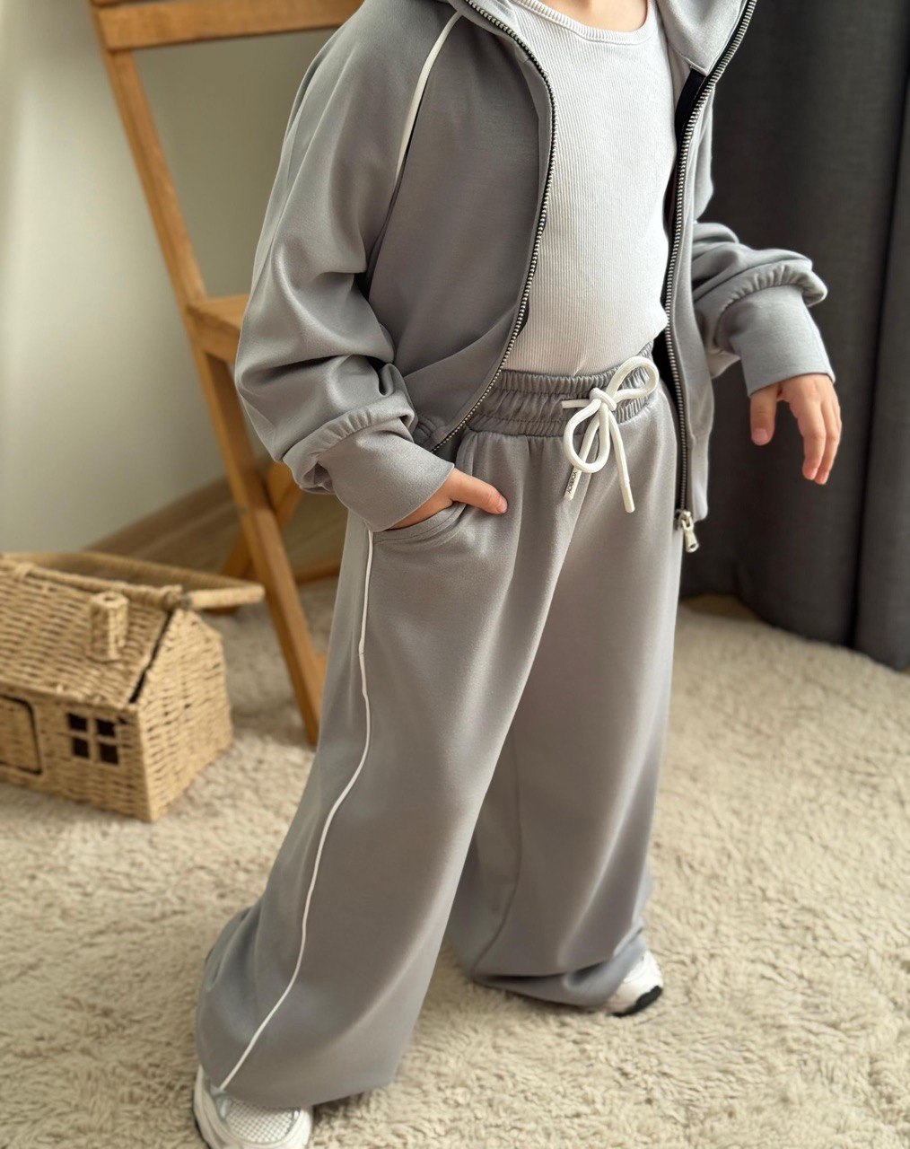 Овој модерен комплет се состои од горно со патент и широки панталони со еластичен струк и декоратив врвка. Изработен е од мек и еластичен материјал, кој овозможува лесно движење и целодневна удобност.