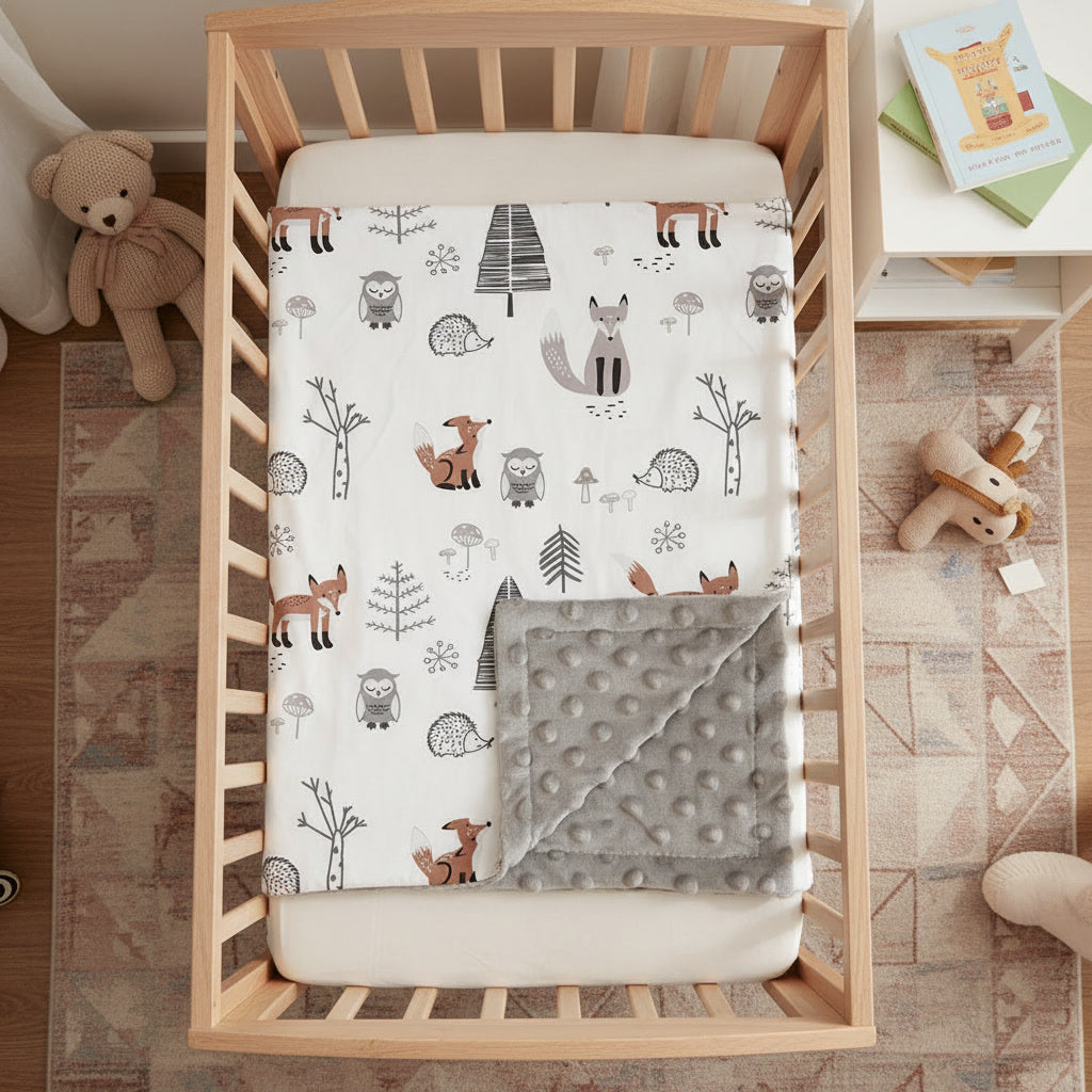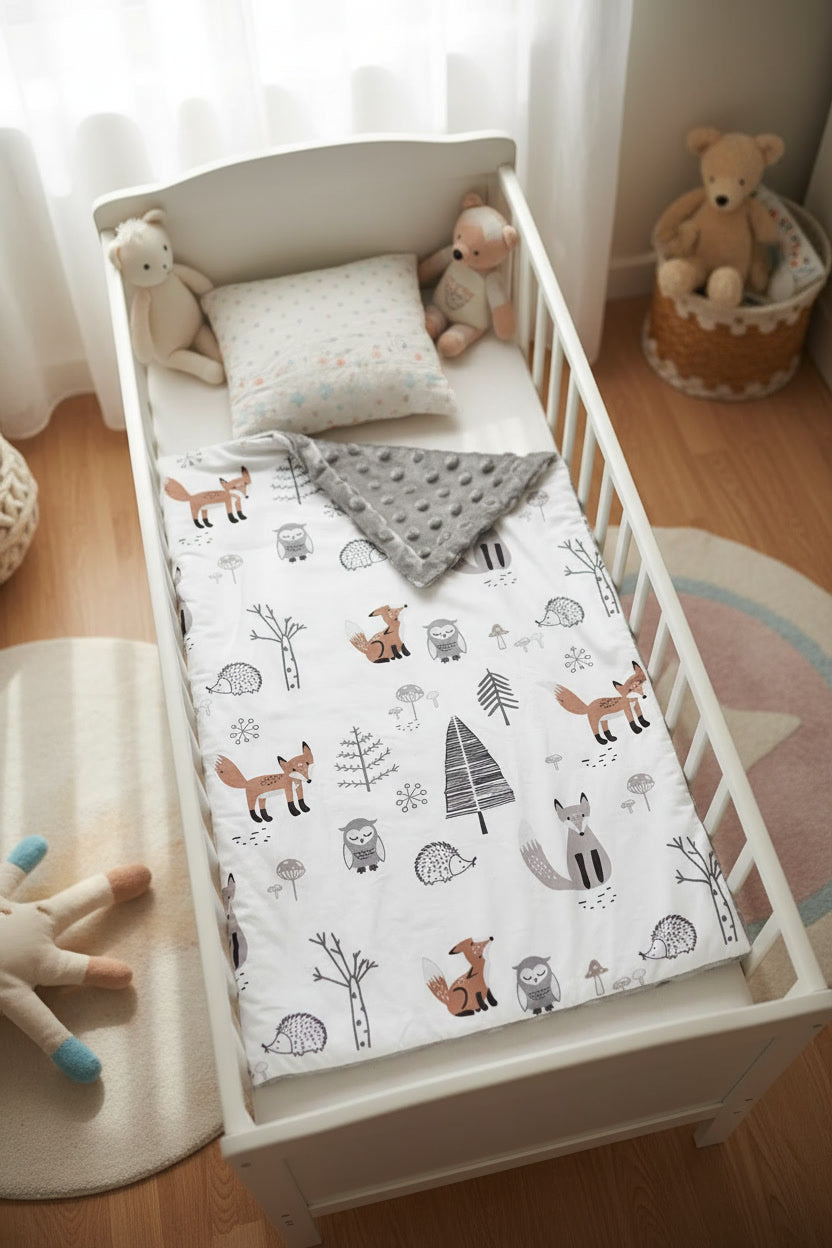 – едната страна со нежен детски принт (животни во смирена, неутрална палета)