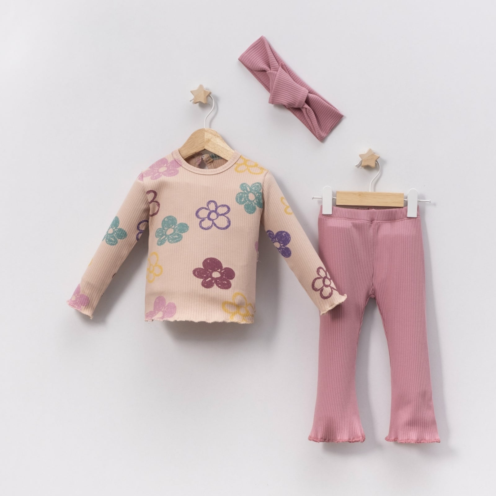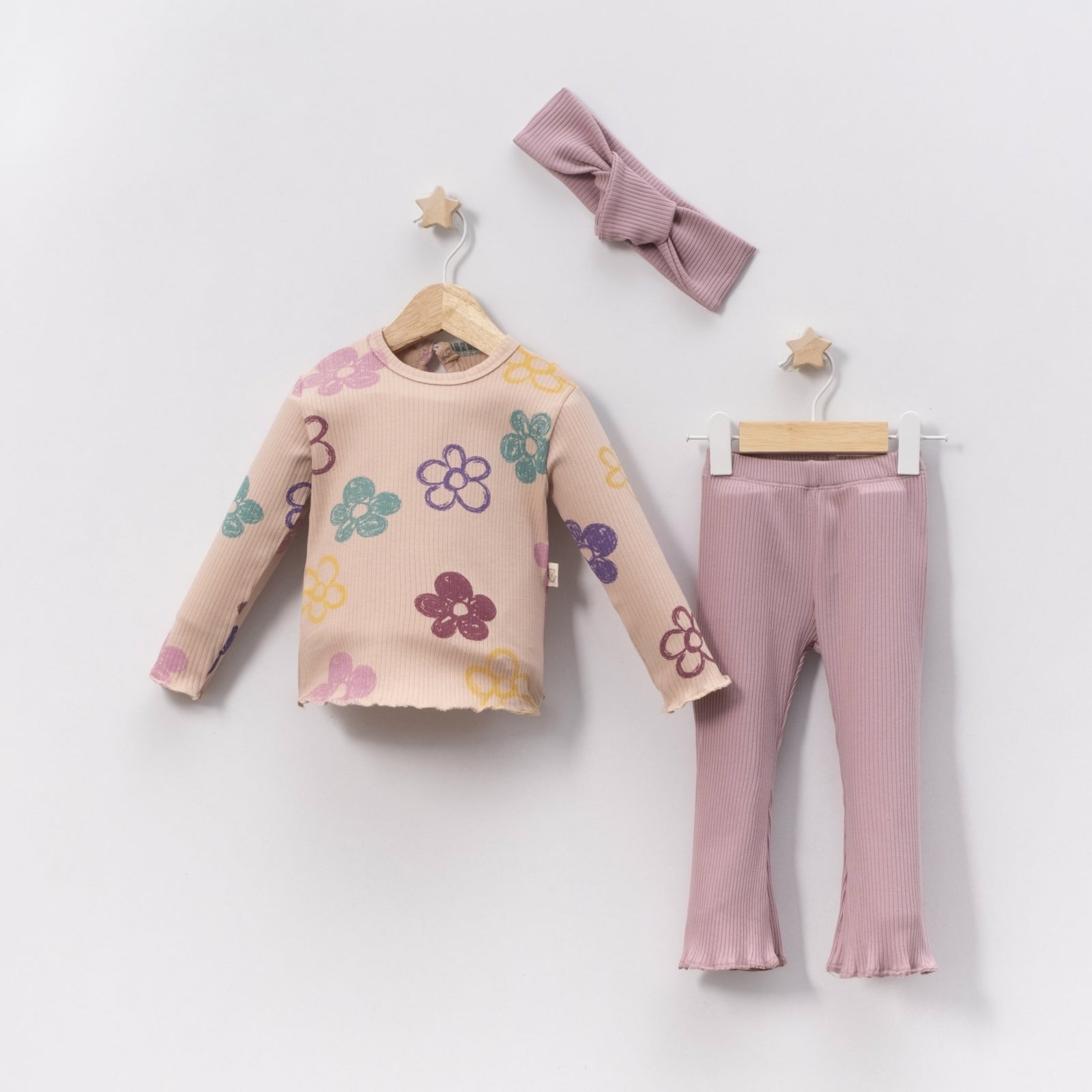 Се состои од блуза со долги ракави и цветен принт, еластични хеланки со мини ѕвон форма и трака за коса во иста боја за комплетен изглед.