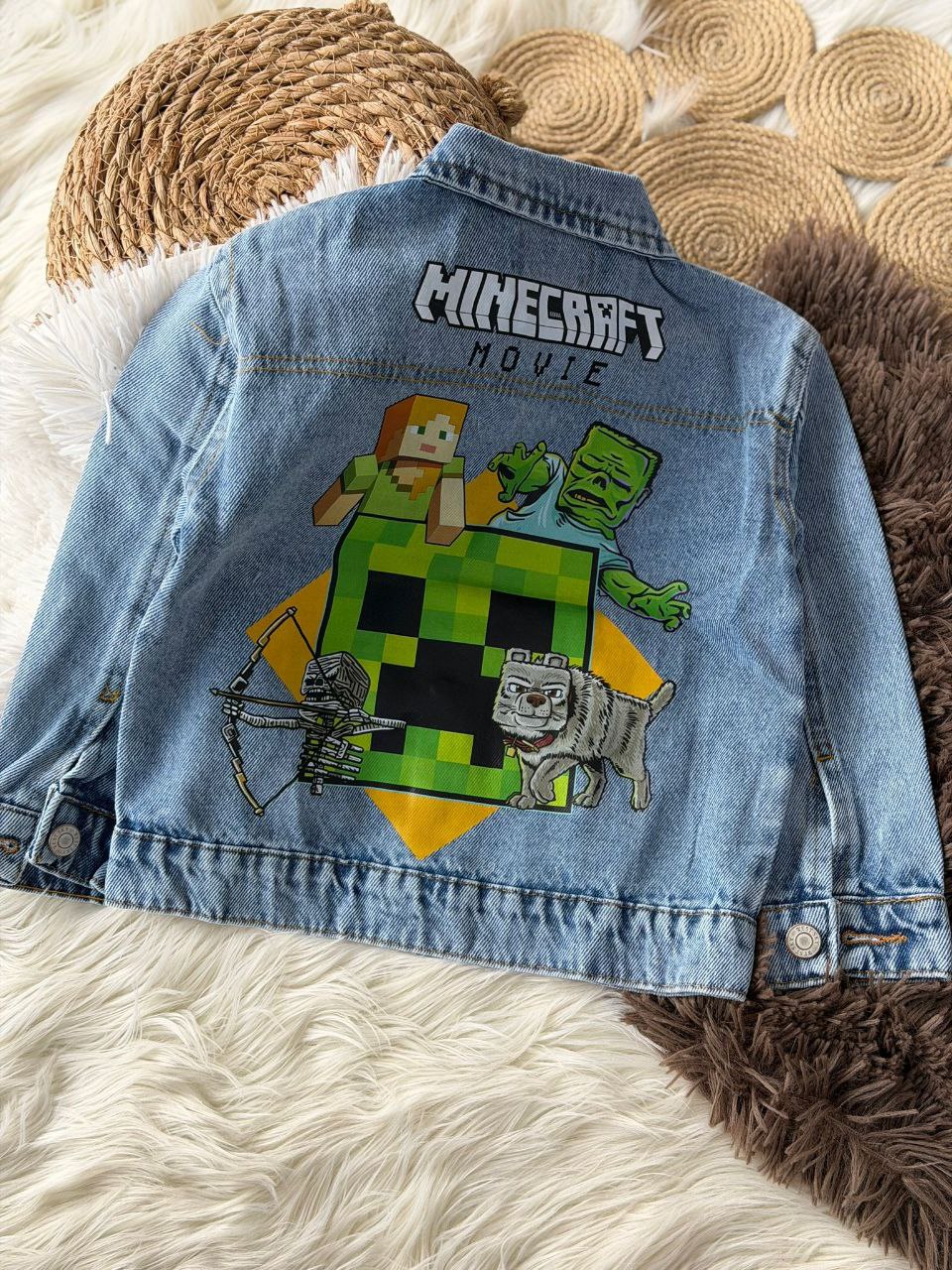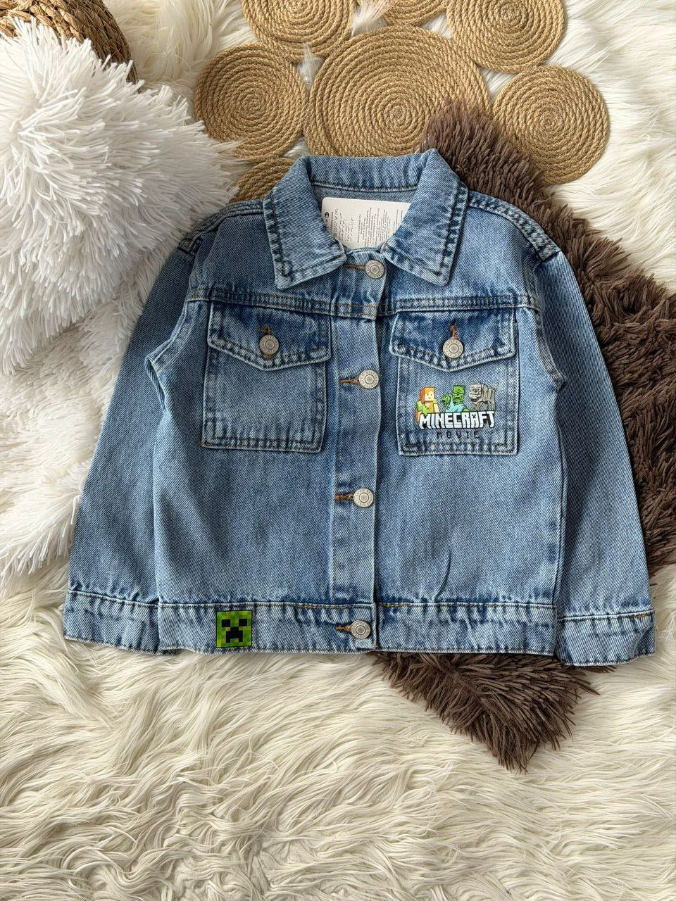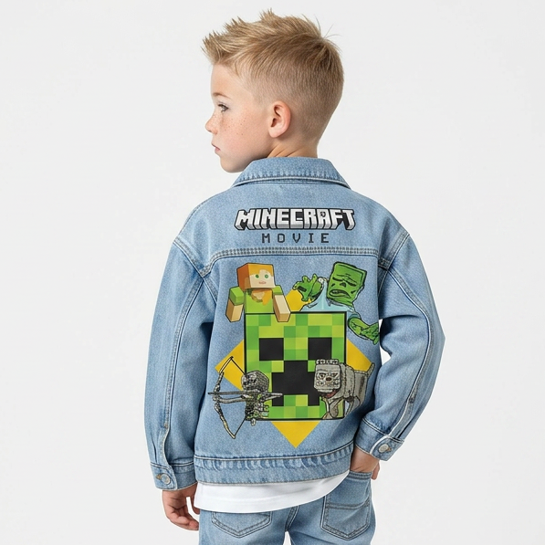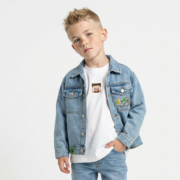 Детска тексас јакна Minecraft – модерен избор за деца кои го обожаваат светот на игри и авантура. Изработена од квалитетен тексас материјал, оваа јакна нуди издржливост, удобност и уникатен дизајн со препознатлив Minecraft принт.
