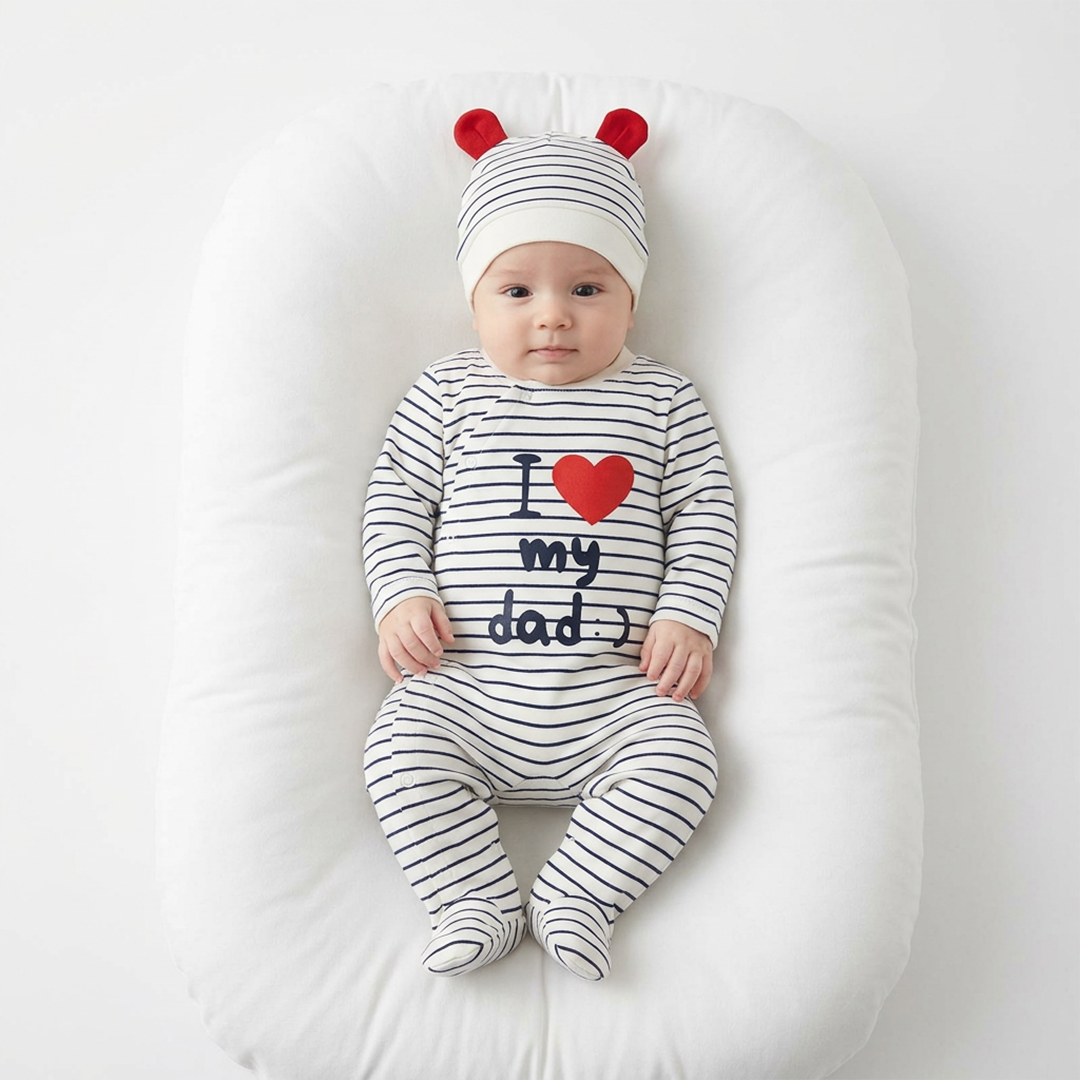 Бебешки шпикозни со натпис „I ❤️ my dad“ и капче – создаден да донесе емоција, стил и удобност во секојдневните моменти.