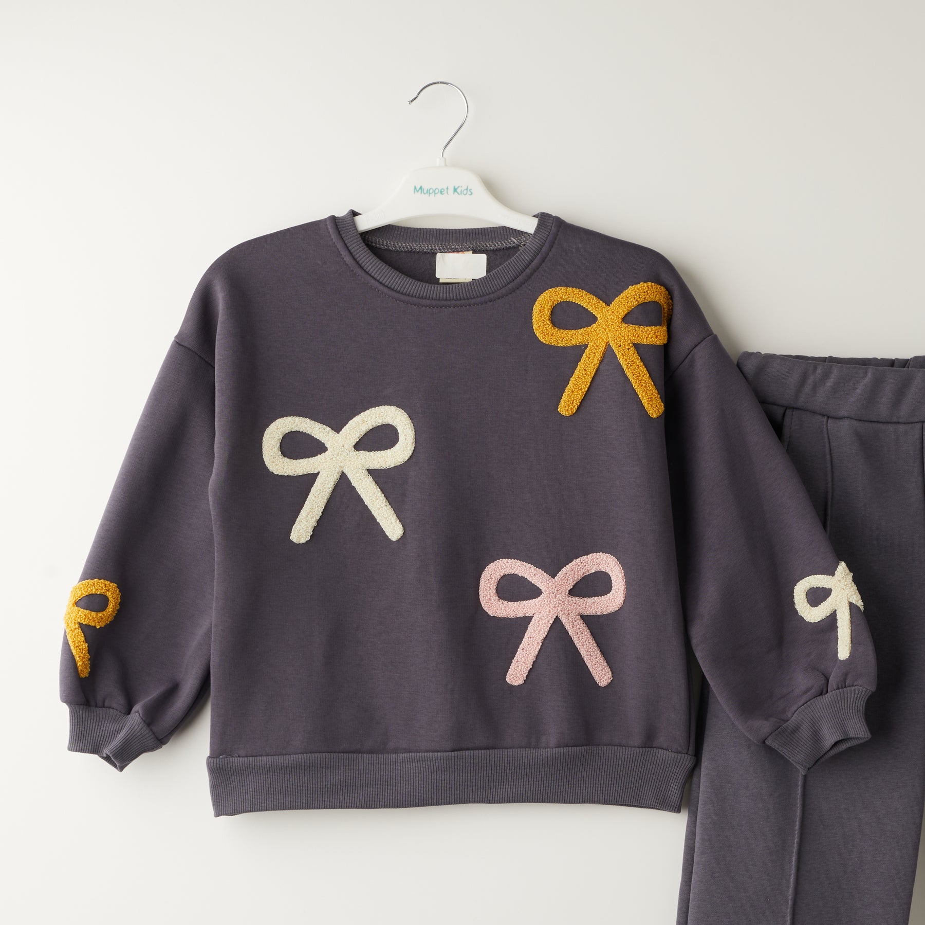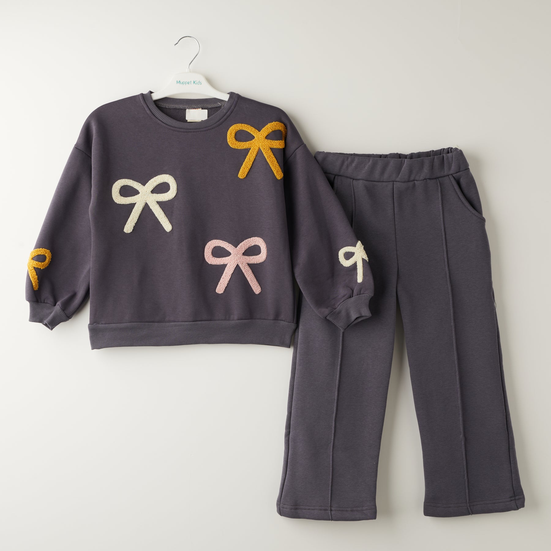 Се состои од мека блуза со апликации во форма на панделки и панталони со широк крој, кои обезбедуваат слободно движење и модерен изглед.