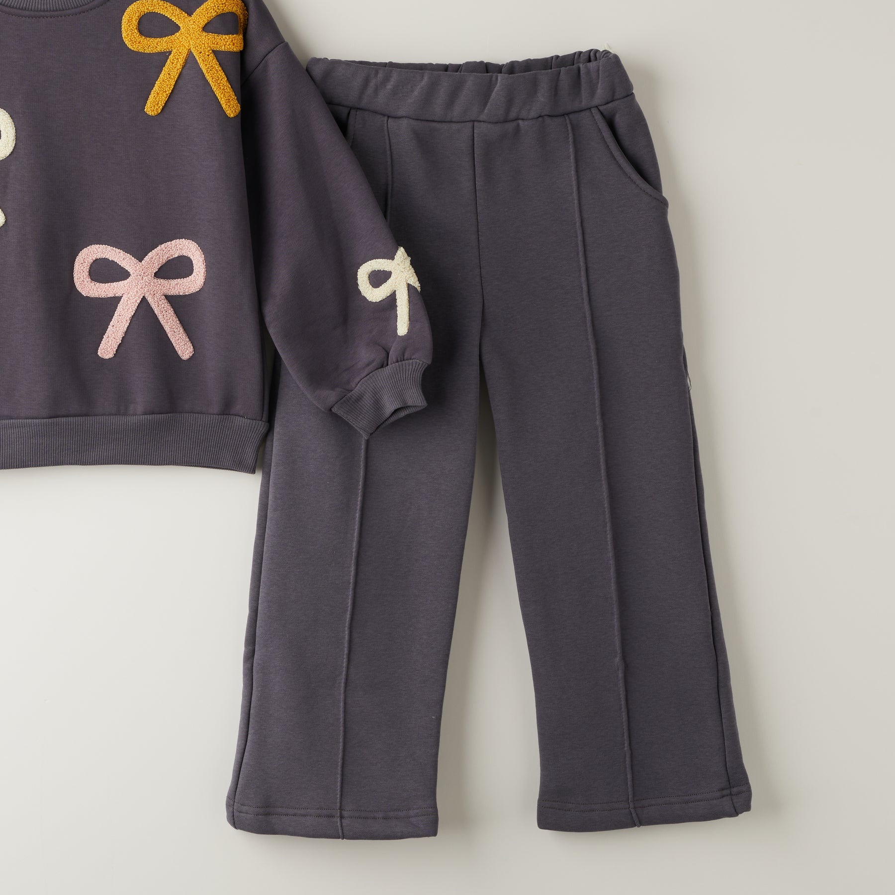 Овој дводелен комплет со панделки е совршен спој на удобност и елеганција за секојдневно носење.