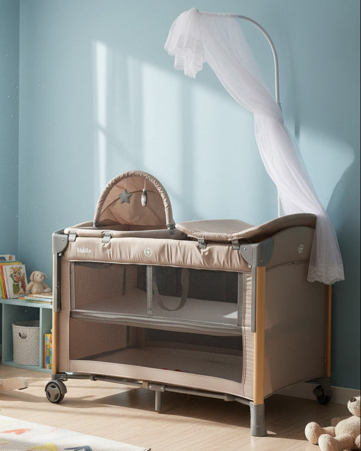✔ Тркалца за лесно поместување: Тркалцата овозможуваат лесно преместување на креветчето од една соба во друга, без напор.
