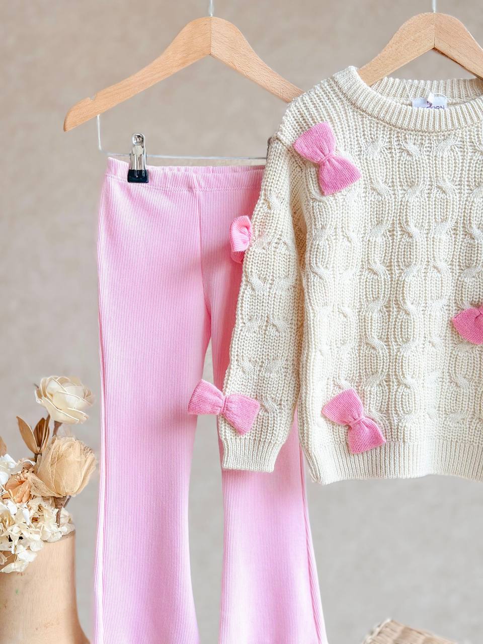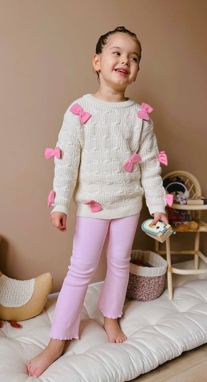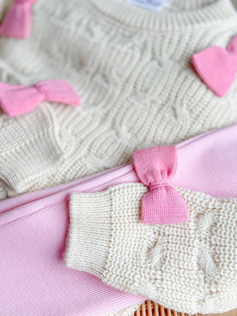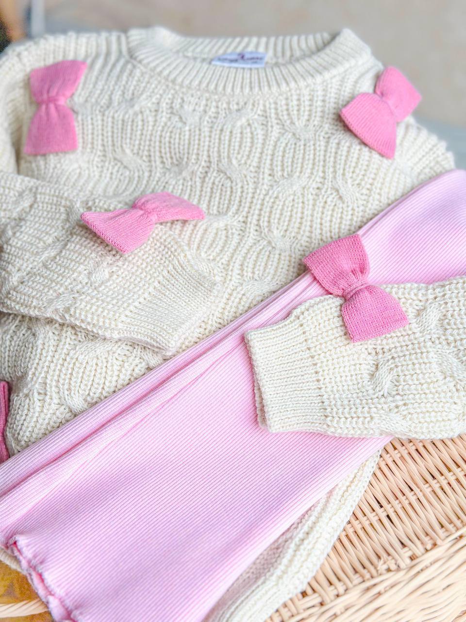• 👕 Содржина: Плетена блуза со аплицирани розови машнички + розови панталони со еластичен струк.