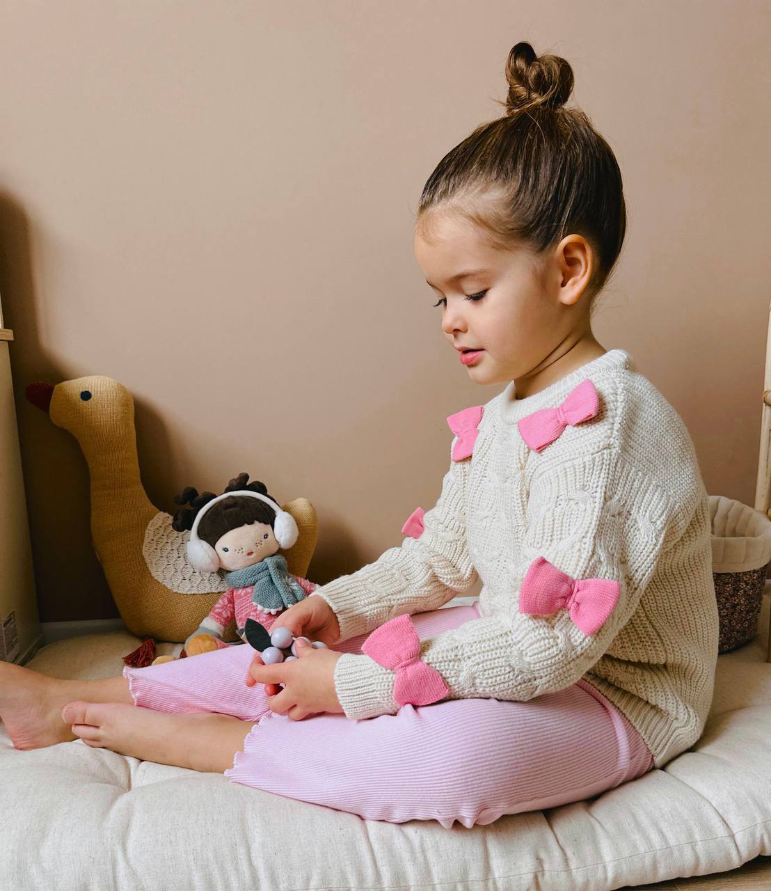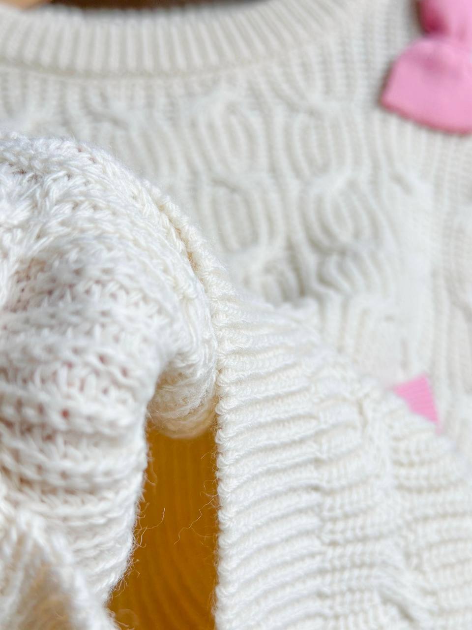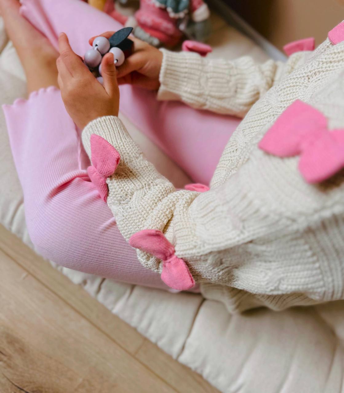 • 👕 Содржина: Плетена блуза со аплицирани розови машнички + розови панталони со еластичен струк.